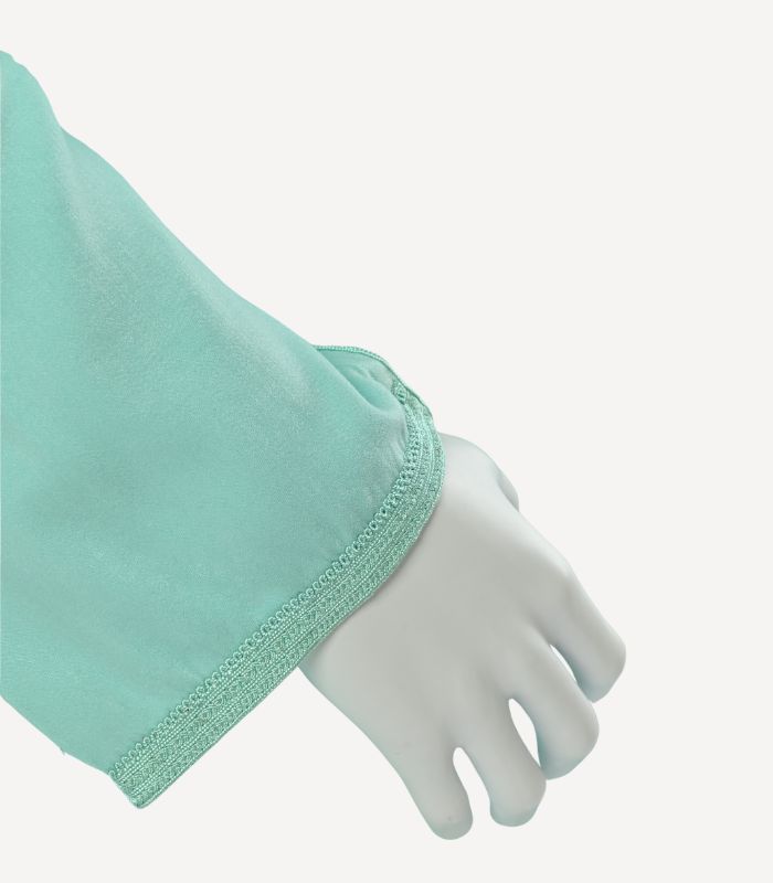 La pièce est délicatement ornée de sabra dyal lhrir, apportant brillance et profondeur aux motifs, tandis que la dfira baldiya br9i9, finement travaillée, structure la silhouette avec subtilité et élégance. Chaque détail reflète patience, précision et excellence artisanale.