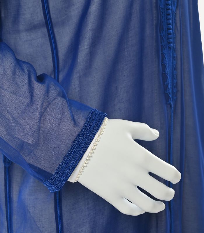 La pièce est entièrement sublimée par une couture à la main de luxe, exécutée avec précision par des artisans expérimentés. Le décor en sabra associée à la soie apporte éclat, profondeur et finesse au rendu final. La dfira baldiya br9i9, délicatement intégrée, souligne les lignes du caftan avec subtilité et équilibre.