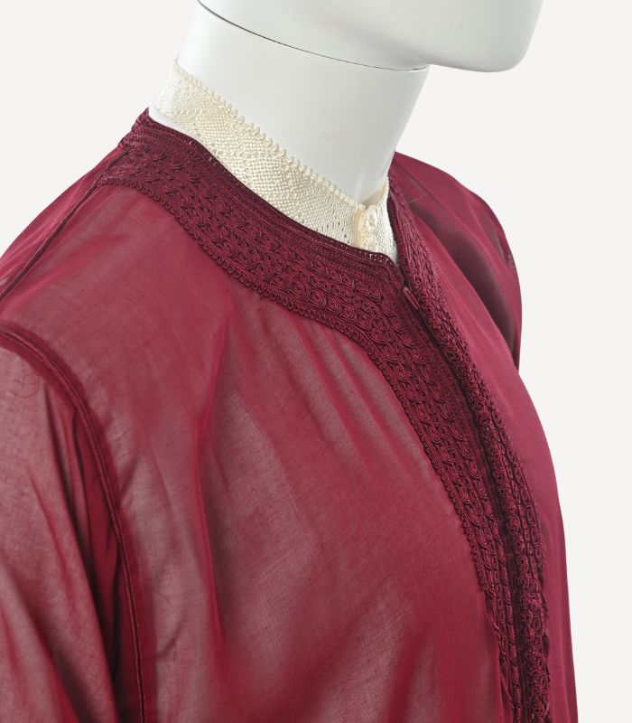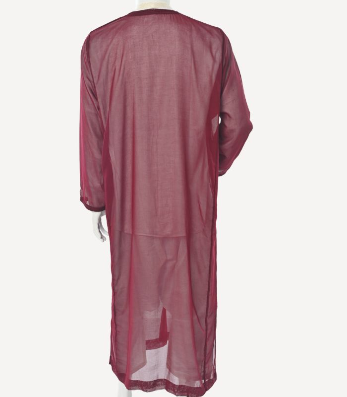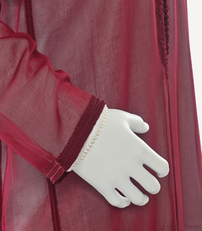 La pièce est entièrement sublimée par une couture à la main de luxe, exécutée avec précision par des artisans expérimentés. Le décor en sabra associée à la soie apporte éclat, profondeur et finesse au rendu final. La dfira baldiya br9i9, délicatement intégrée, souligne les lignes du caftan avec subtilité et équilibre.