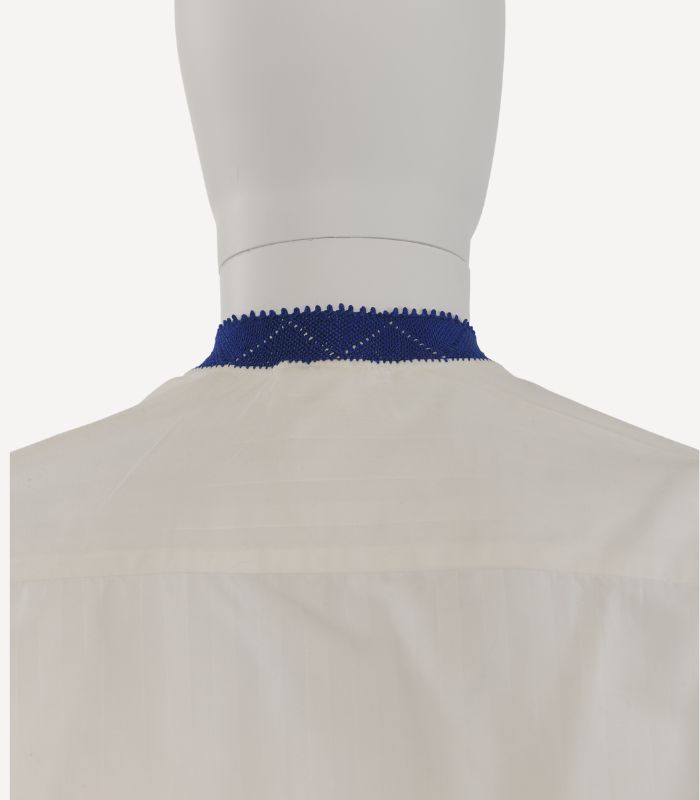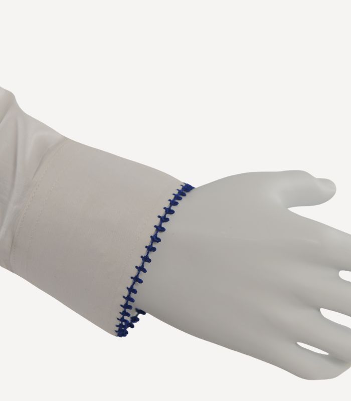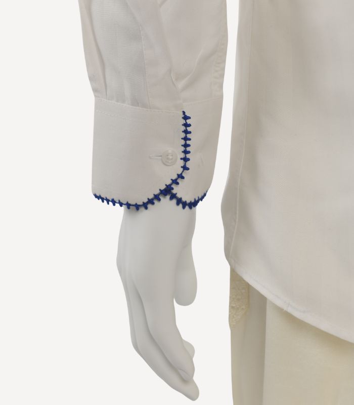 Chemise artisanale conçue pour être portée sous la jellaba, signée Maison El Kohen. Réalisée avec une technique randa traditionnelle entièrement brodée à la main avec fil de laine, elle se distingue par son dars finement exécuté au niveau des manches et le long de la pièce. Une création raffinée, témoin du savoir-faire couture marocain.