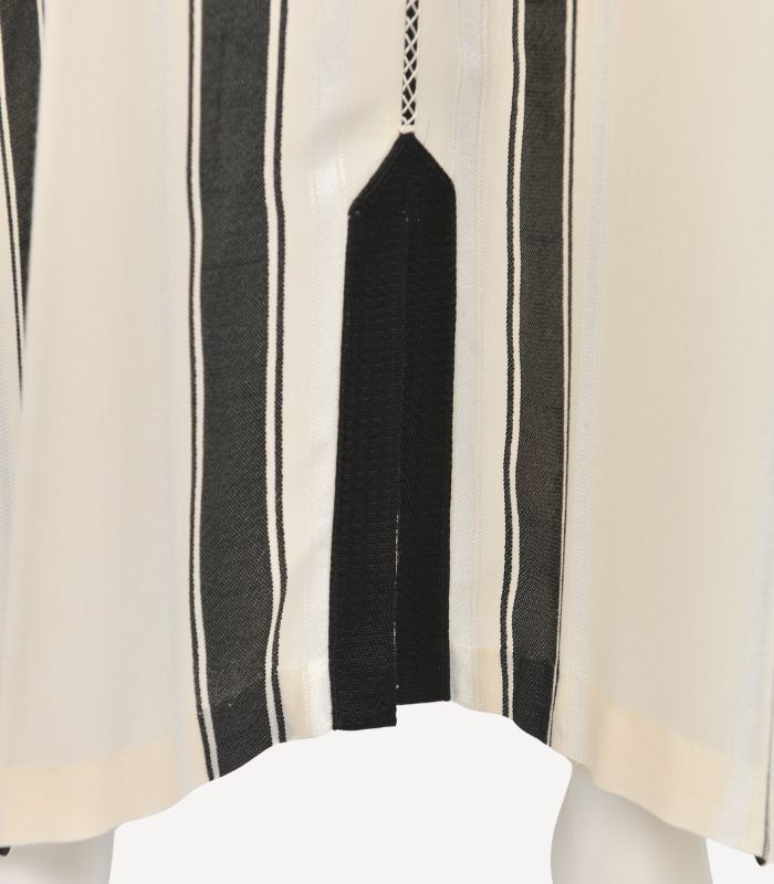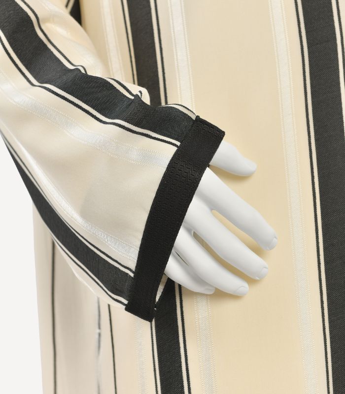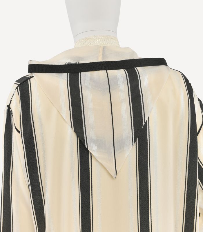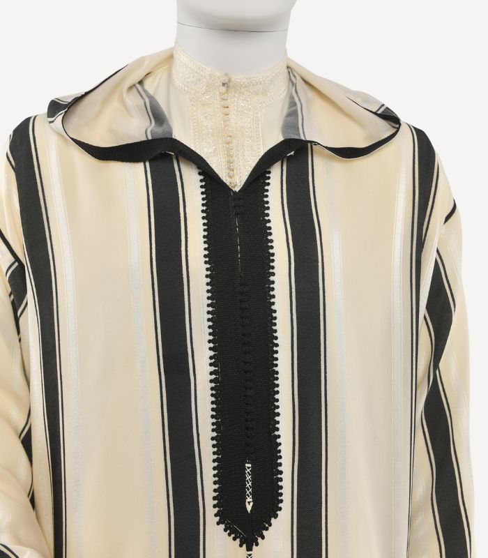 La pièce est sublimée par des finitions traditionnelles en sfifa de mrama et debbana, exécutées avec précision dans le respect des techniques artisanales ancestrales. Ces détails apportent structure, raffinement et caractère à la jellaba, tout en soulignant la maîtrise du travail manuel.