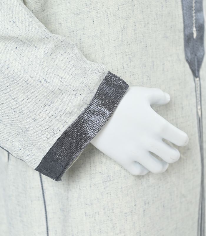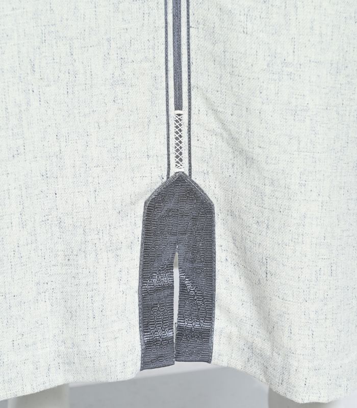 Le modèle est réalisé à la fois à la main et en machine, permettant d’allier précision technique et valeur artisanale. La pièce est sublimée par une sfifa mrama en jacquard, détail raffiné qui structure la djellaba et souligne ses lignes avec distinction.
