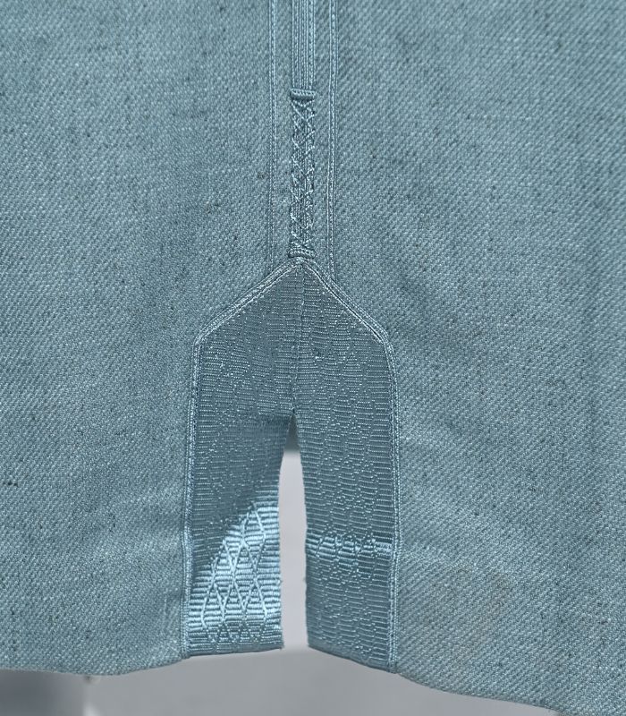 La réalisation combine un travail à la main et en machine, permettant d’atteindre un niveau de finition précis tout en préservant la valeur artisanale de la pièce. L’ensemble est subtilement structuré par une sfifa mrama en jacquard, élément signature du patrimoine textile marocain, qui ajoute relief, contraste et sophistication visuelle.