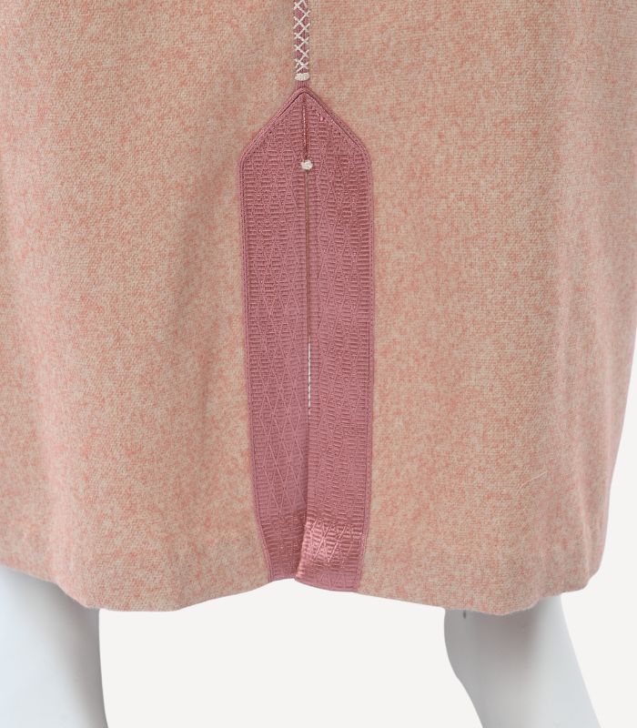 La réalisation combine un travail à la main et en machine, permettant d’atteindre un niveau de finition précis tout en préservant la valeur artisanale de la pièce. L’ensemble est subtilement structuré par une sfifa mrama en jacquard, élément signature du patrimoine textile marocain, qui ajoute relief, contraste et sophistication visuelle.
