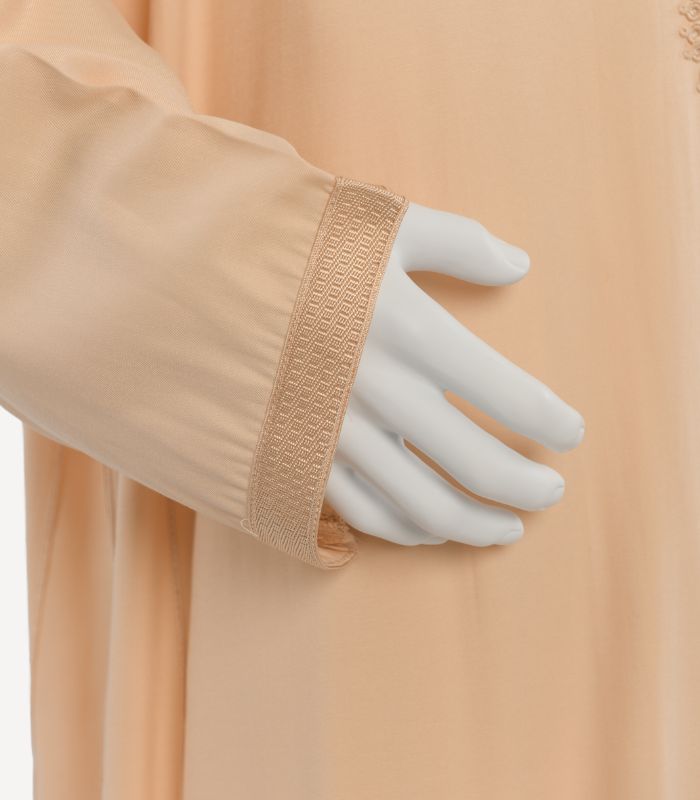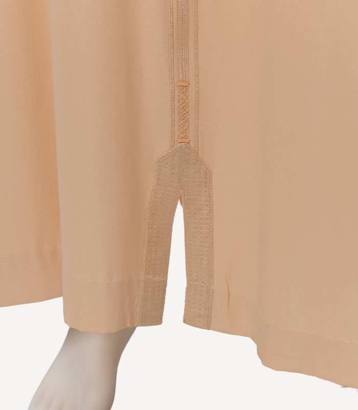 La pièce est réalisée à 30 % à la main, valorisant un travail artisanal précis qui respecte les codes de la couture traditionnelle marocaine. Chaque finition témoigne du soin apporté aux détails et de la maîtrise du geste, garantissant une tenue à la fois élégante et durable.