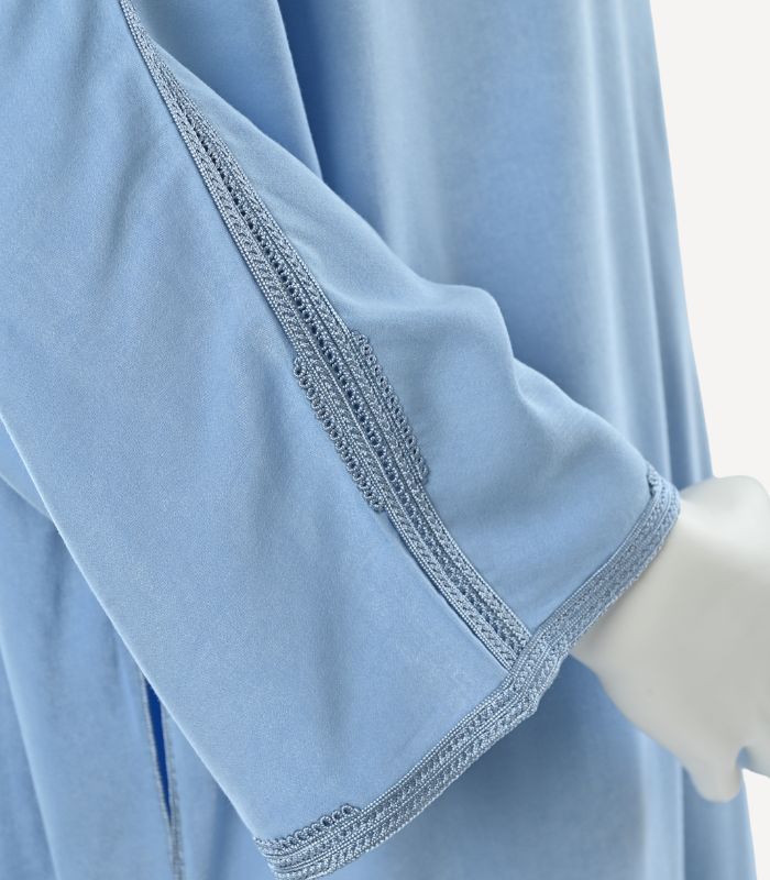 Ce modèle Zwak Maalam est entièrement travaillé en couture à la main de luxe, reflétant une maîtrise artisanale exigeante. La sabra de soie, délicatement intégrée, apporte profondeur et luminosité aux motifs, tandis que la dfira baldiya br9i9, finement exécutée, structure la pièce avec précision et harmonie.