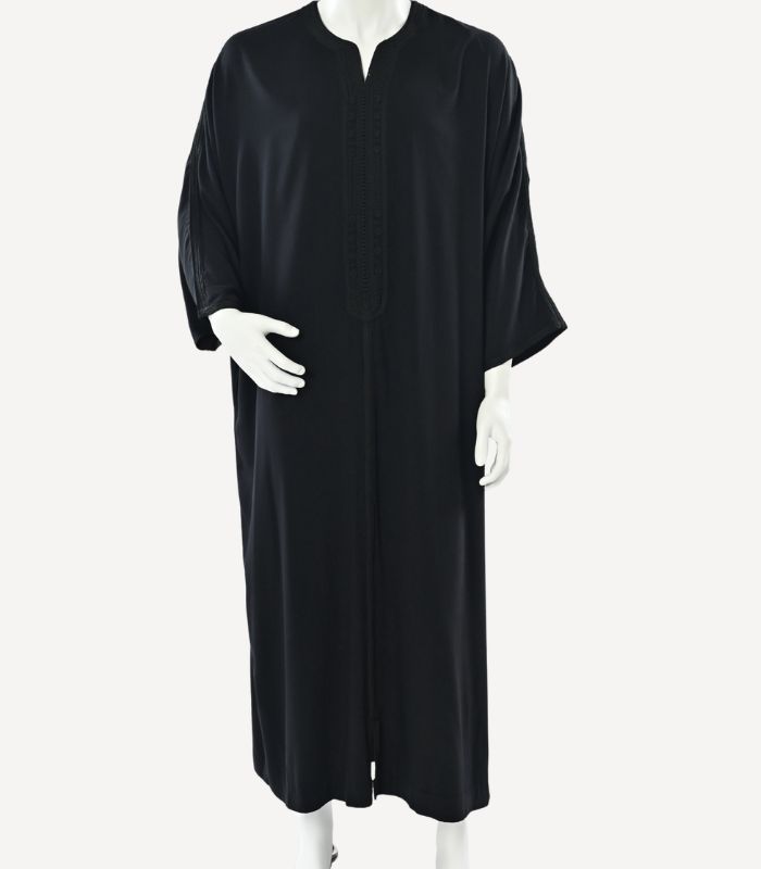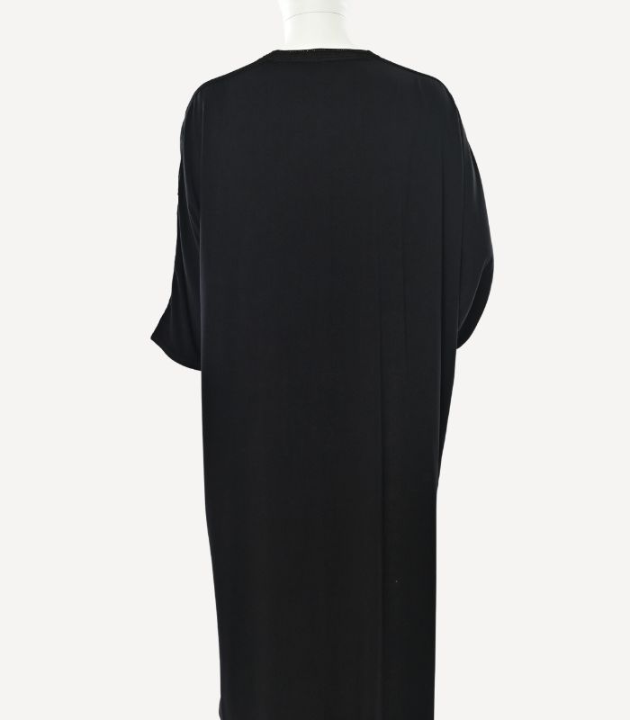 Ce modèle Zwak Maalam est entièrement travaillé en couture à la main de luxe, reflétant une maîtrise artisanale exigeante. La sabra de soie, délicatement intégrée, apporte profondeur et luminosité aux motifs, tandis que la dfira baldiya br9i9, finement exécutée, structure la pièce avec précision et harmonie.