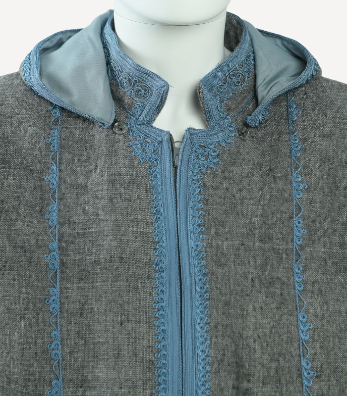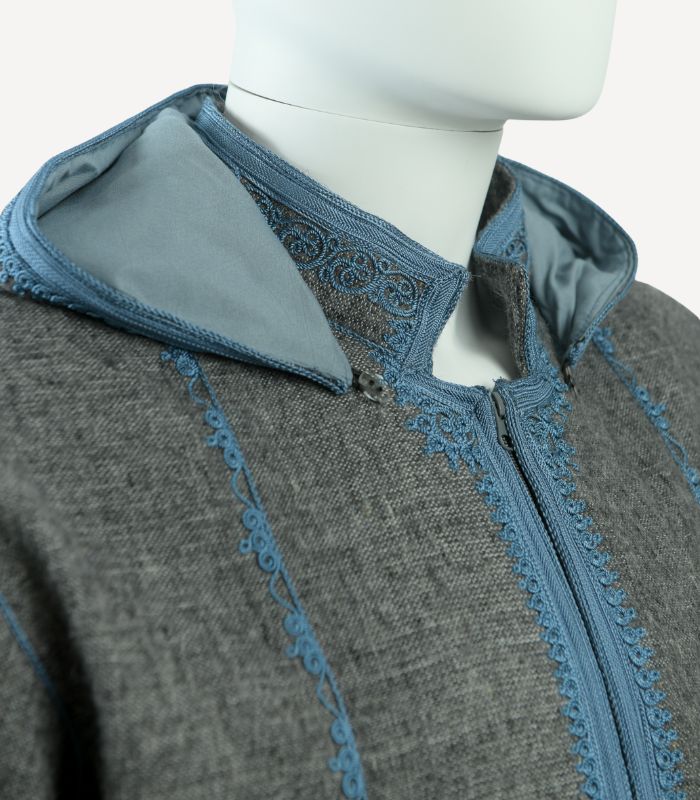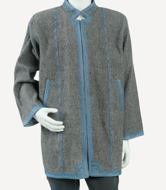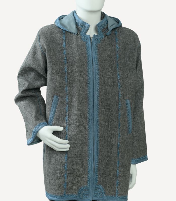 Manteau ouazzani authentique en tissu chakhma de laine, fabriqué exclusivement à Ouazzane en laine 100 % originale, doté d’une doublure intérieure avec poches. Il se distingue par son double col officier et sa capuche démontable, alliant tradition et fonctionnalité.