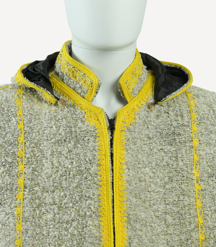 Manteau ouazzani authentique en tissu Habba Beldia, fabriqué en machine manivelle selon la tradition de Ouazzane. Doté d’une doublure intérieure avec poches, il se distingue par son double col officier et sa capuche démontable, alliant héritage artisanal et fonctionnalité moderne.